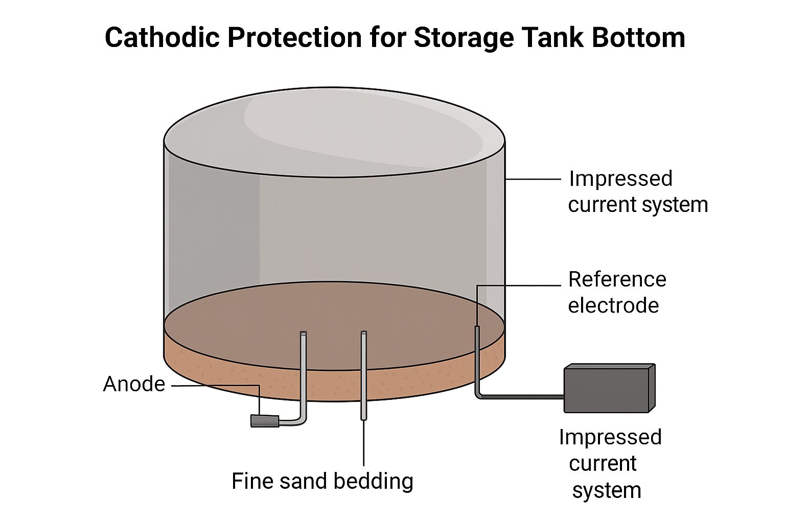 The bottom of the tank can be protected by an impressed current system or by cathodic protection using sacrificial anodes. For large storage tanks, when the soil resistivity is high, it is advisable to use the impressed current cathodic protection method. For small storage tanks in low soil resistivity environments, it is preferable to use the cathodic protection method with sacrificial anodes.